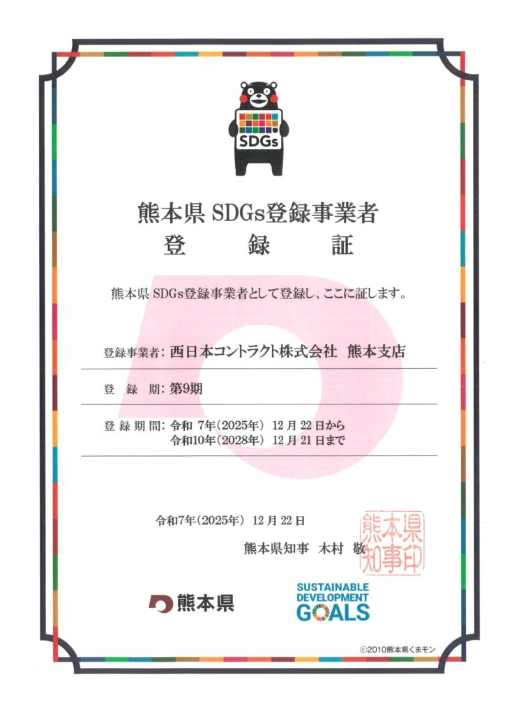 この度、西日本コントラクト株式会社は、熊本県が実施する「熊本県SDGs登録制度」において、SDGs登録事業者となりました。
