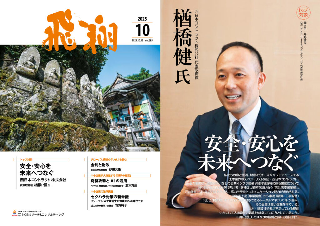 このたび経営情報誌『飛翔』(2025年10月号/2025年10月15日発刊)に、西日本シティ銀行グループの株式会社NCBリサーチ&コンサルティング 代表取締役社長 井野 誠司様と弊社 代表取締役 楢橋 健 との対談記事が掲載されました。