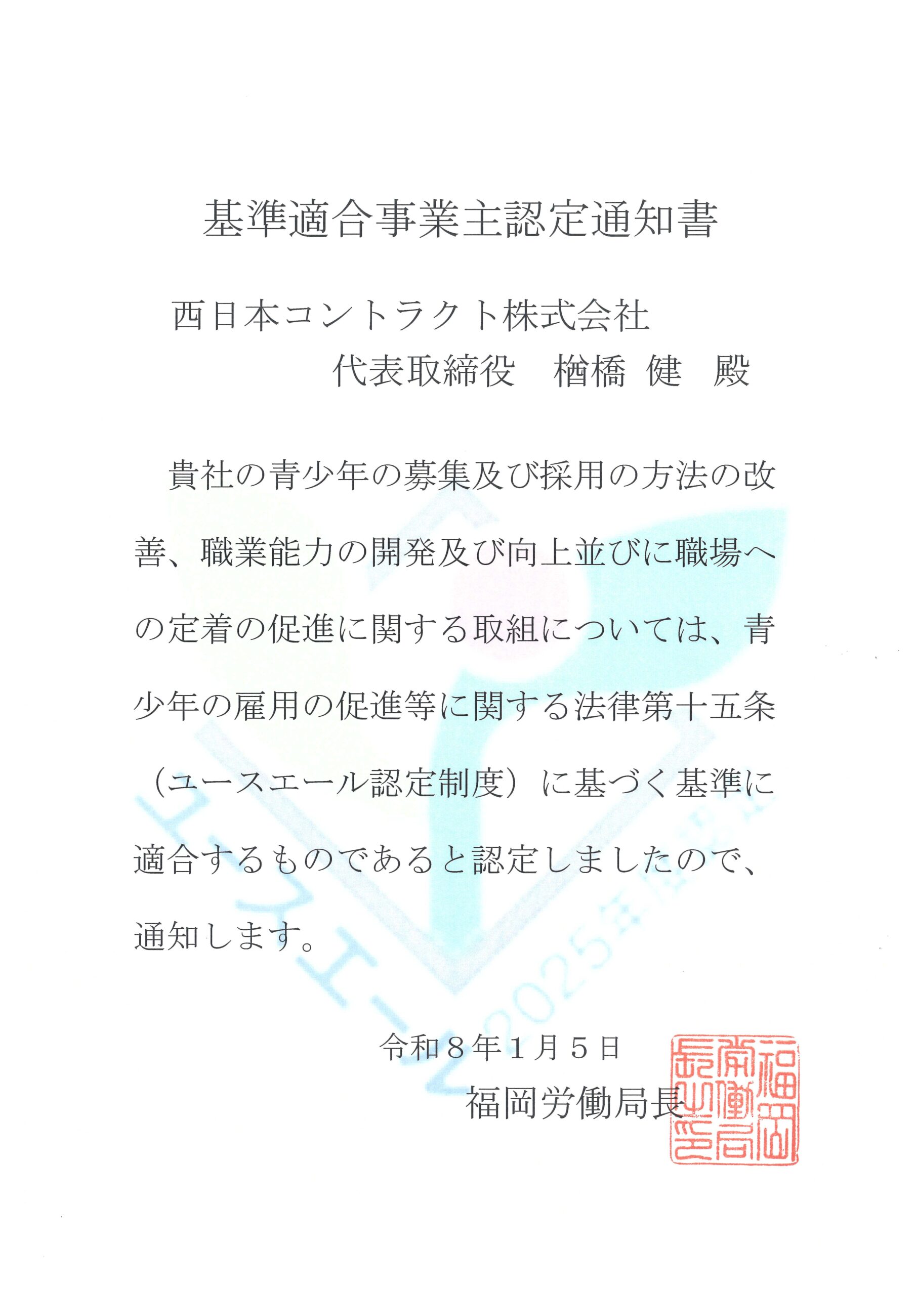 このたび、令和8年1月5日をもって、西日本コントラクト株式会社は若者の採用・育成に積極的かつ働きやすい職場環境を整えている企業として厚生労働省より「ユースエール認定企業」として認定を受けました。